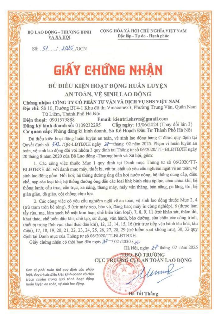 • Pháp lý minh bạch, chuẩn xác: SHS Việt Nam sở hữu đầy đủ Giấy chứng nhận đủ điều kiện hoạt động do Cục An toàn lao động (Bộ LĐTBXH) cấp phép. Mọi chứng chỉ huấn luyện và hồ sơ kiểm định do chúng tôi cung cấp đều có giá trị pháp lý cao nhất, giúp doanh nghiệp vững tâm vượt qua mọi đợt thanh tra.