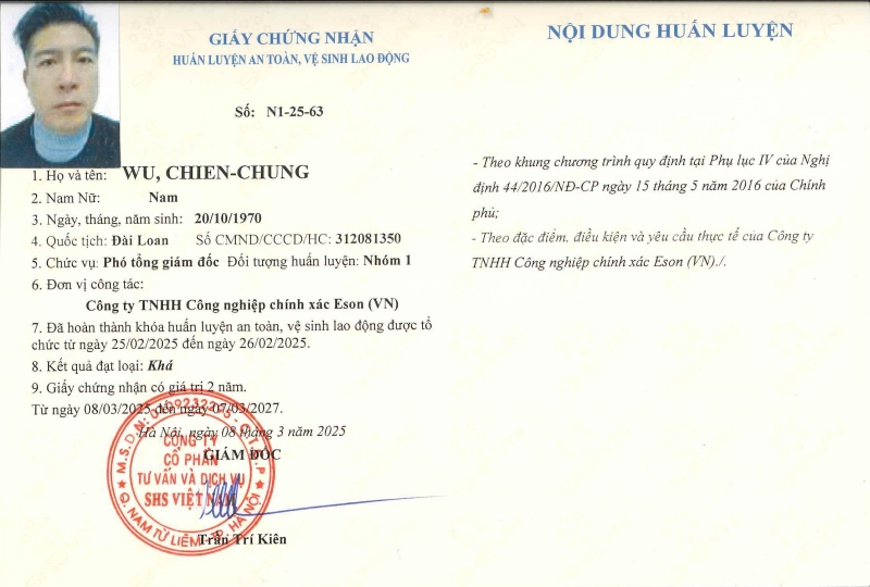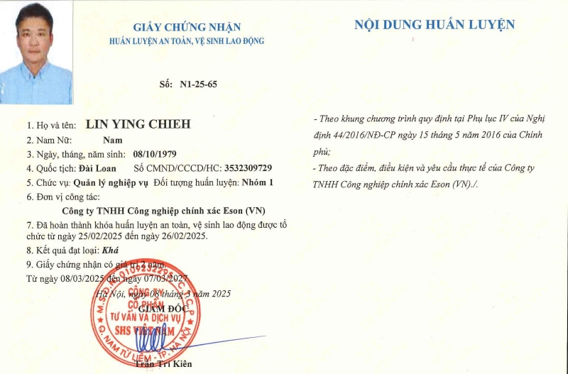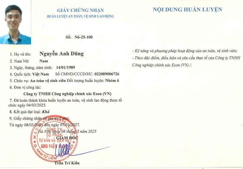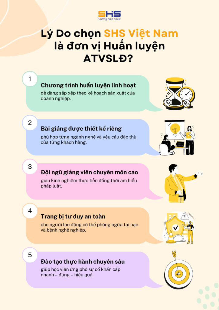 • Cam kết bằng văn bản: SHS Việt Nam được Bộ Lao động – Thương binh và Xã hội cấp phép hoạt động huấn luyện ATVSLĐ (Giấy chứng nhận số 51/2025/GCN cấp ngày 27/02/2025). Mọi chứng chỉ và thẻ an toàn chúng tôi cấp ra đều có giá trị pháp lý tuyệt đối trên toàn quốc.