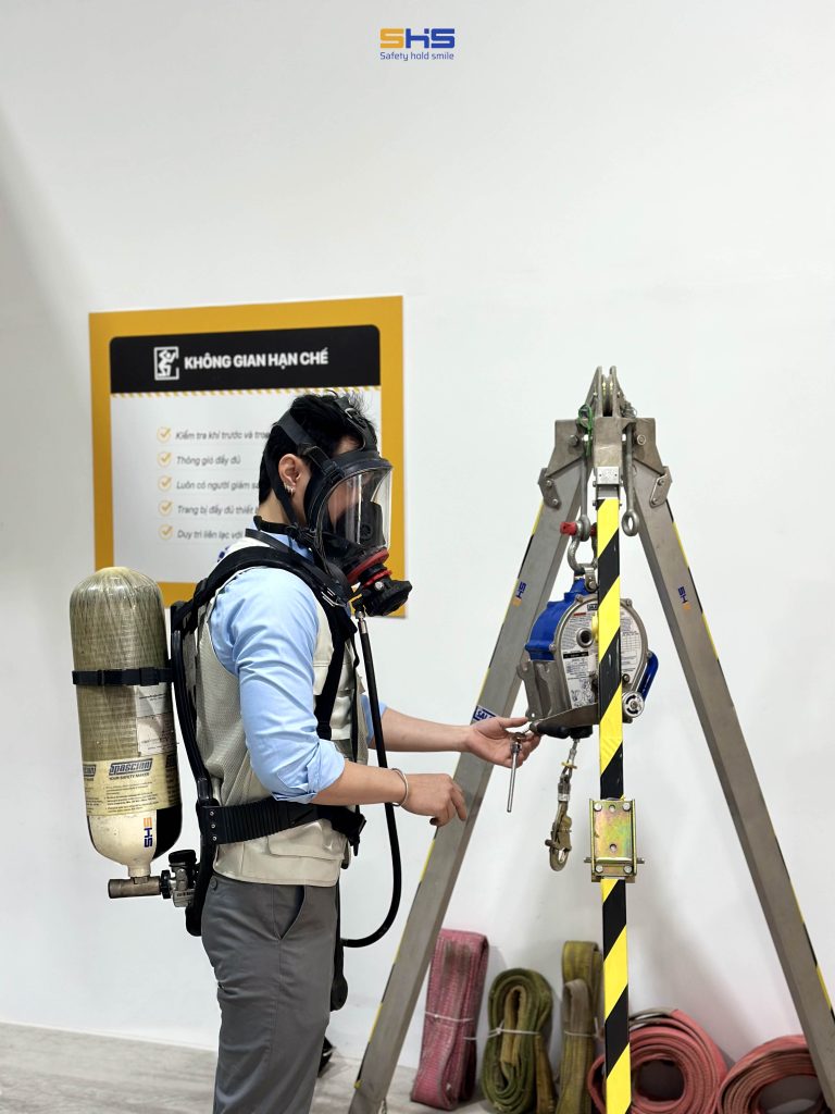 Bộ áo kèm bình khí, mặt nạ chuyên dụng, đèn pin… phục vụ huấn luyện các quy trình ra vào không gian kín và ứng cứu khẩn cấp.