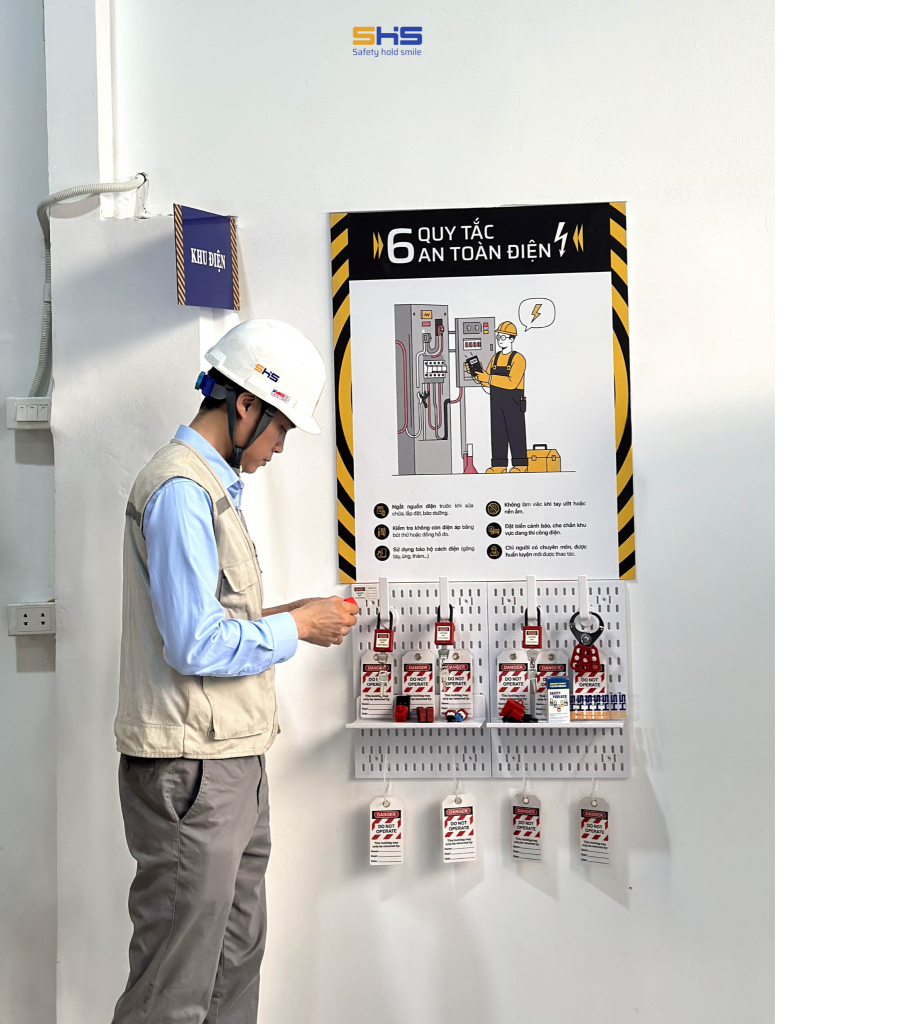 Tủ điện và thiết bị LOTO được bố trí thực tế để học viên thực hành cô lập nguồn, nhận diện nguy cơ và thao tác an toàn điện.